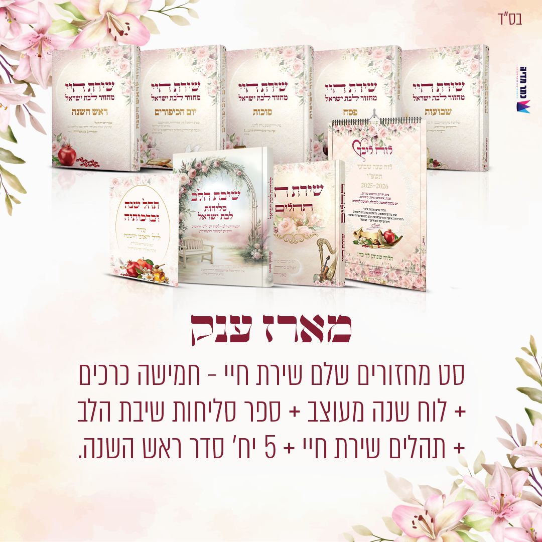 *מארז ענק – סט מחזורים שלם, ספר סליחות שיבת הלב, לוח שנה מעוצב, 5 יח׳ סדר ליל ראש השנה ותהלים